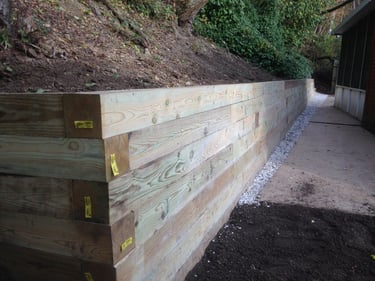 On steep hillsides with limited access, timber walls excel: they form one monolithic structure that better withstands erosion below, reducing long-term failure risks unlike segmented retaining wall options. They’re especially great when heavy equipment isn’t an option or access is limited to a small walk-behind Dingo—allowing precise placement without major site disruption.